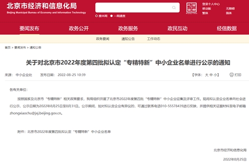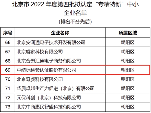 近日,北京市经济和信息化局2022年度北京市“专精特新”中小企业名单已完成公示,best365官方网站检验认证股份有限公司成功上榜拟认定企业。