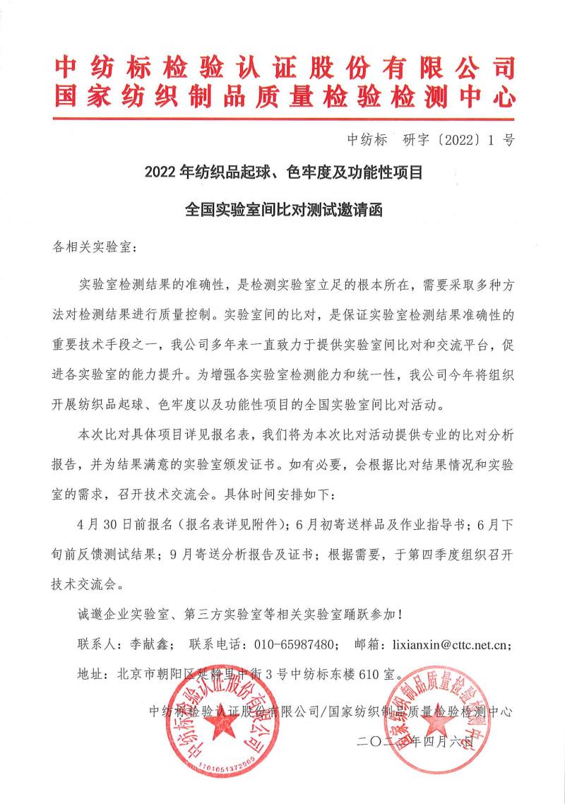 邀请函:2022年度纺织品起球、色牢度以及功能性项目的全国实验室间比对活动邀请函