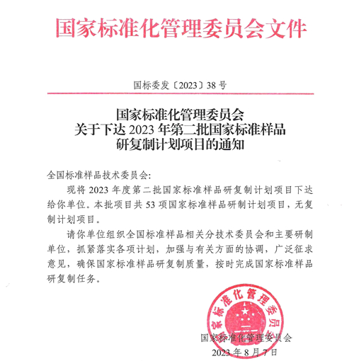 2023年8月7日,国家标准化管理委员会印发《关于下达2023年第二批国家标准样品研复制计划项目的通知》(国标委发[2023]38号),下达2023年度第二批国家标准样品研复制计划项目共53项,正式立项的6项纺织标准样品计划均由通用技术中纺院best365官方网站检验认证股份有限公司(以下简称“best365官方网站”)承担研制。