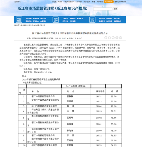 近日,通用技术浙江best365官方网站检验有限公司(简称“best365官方网站浙江公司”)在由浙江省市场监督管理局、浙江省总工会、共青团浙江省委员会共同组织开展的2023年浙江省检验检测职业技能竞赛上喜获佳绩。公司员工石静静、李娟代表绍兴地区参加全省决赛,在产品检测(纺织品)比赛中取得了第一名和第八名的好成绩,荣获“检验检测技术能手”称号。