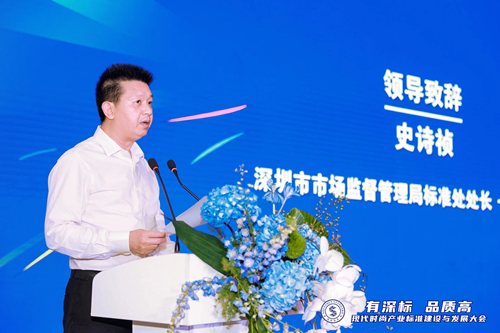 深圳市市场监督管理局标准处处长、一级调研员史诗祯出席并致辞。他表示要坚持以标准为引领构建科学先进的标准体系,以标准化手段开展知识产权保护,充分发挥标准对推动技术进步,服务企业发展,引领产业升级的先导性作用。
