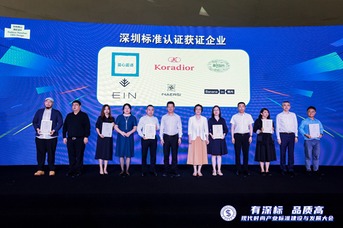 经过多年的发展,深圳已发展成为国内行业门类最齐全、原创品牌最集中、产业配套最完善、规模集聚效应最显著的时尚产业基地之一,服装时尚产业在全国处于引领地位,更是被誉为“中国女装之都”。深圳标准定位于“国内领先,国际一流”的评价体系,以先进标准、卓越品质为评价维度验证产品性能和服务体验,突显产品和服务的竞争优势;以城市品牌的形象,为市场推介优秀的产品和优质的服务,向社会传递高标准引领、高质量发展的理念。本次有多家服装企业产品获得深圳标准认证证书,与会领导共同为获证企业颁发了深圳标准认证证书。
