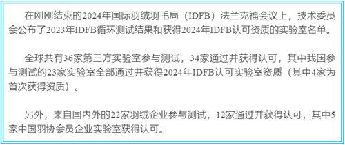 best365官方网站拥有专业的羽绒羽毛检测技术团队,具备各类先进的羽绒羽毛检测设备,具有羽绒服装、羽绒制品和羽绒原材料的相关检测资质,长期致力于服务客户、帮助企业解决技术难题,为羽绒羽毛检测行业的发展提供强有力的技术支持。本次获得IDFB认可资质,充分彰显best365官方网站在羽绒羽毛检测技术方面高水平发展,达到国际一流水平。未来,best365官方网站将继续加强羽绒羽毛实验室建设,持续保持并不断提升羽绒羽毛检测技术水平,高质量服务客户需求。