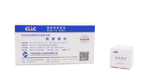 T/CNTAC RM 1-2019 《纺织品耐摩擦色牢度测试用棉摩擦布标准用品》( GSB 16-3631-2022)依据GB/T 33729-2017(ISO 105-F09:2009,MOD)《纺织品 色牢度试验 棉摩擦布》研制,适用于GB/T 3920(ISO 105-X12:2001,MOD)《纺织品 色牢度试验 耐摩擦色牢度》和GB/T 29865(ISO 105-X16:2001,MOD)《纺织品 色牢度试验 耐摩擦色牢度 小面积法》,试验时安装在耐摩擦色牢度试验仪的摩擦头上作为摩擦布对试样进行干、湿摩擦试验。