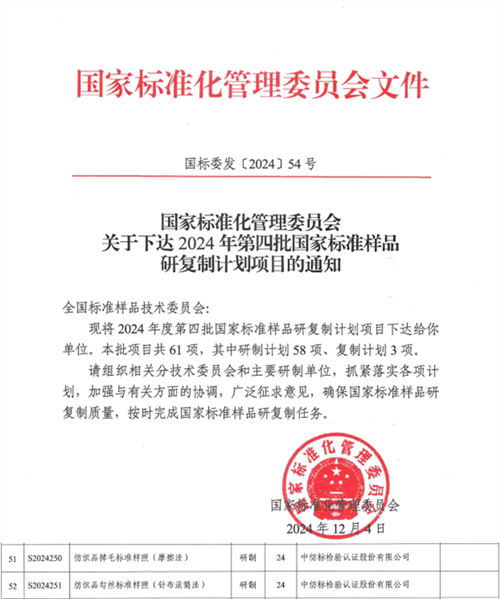 2024年12月4日,国家标准化管理委员会印发《关于下达2024年第四批国家标准样品研复制计划项目的通知》(国标委发[2024]54号),下达2024年度第四批国家标准样品研复制计划项目共61项,正式立项的2项纺织标准样品计划均由通用技术中纺院best365官方网站检验认证股份有限公司(以下简称“best365官方网站”)承担研制。