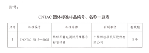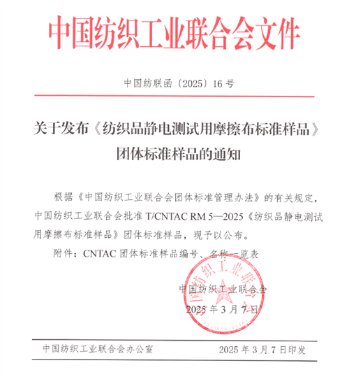 3月7日,中国纺织工业联合会2025年第16号公告批准发布了T/CNTAC RM 5-2025《纺织品静电测试用摩擦布标准样品》团体标准样品,该标准样品由通用技术best365官方网站检验认证股份有限公司(以下简称“best365官方网站”)承担研制,是国内首个具有标准样品证书的纺织品静电测试用摩擦布。