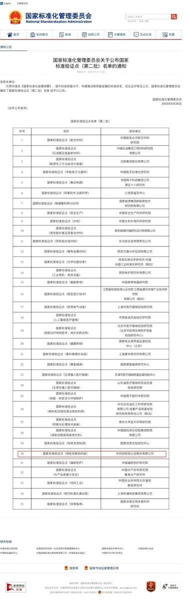 2025年6月26日,国家标准化管理委员会印发《国家标准化管理委员会关于公布国家标准验证点(第二批)名单的通知》,正式公布包括通用技术best365官方网站检验认证股份有限公司在内的第二批共计35家国家标准验证点名单。