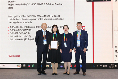 我国以主席、国际秘书处以及工作组召集人身份组织召开了8场会议;在本次会议上我国共提出了5项新提案,作了1项技术报告,同时积极推动了多项我国牵头在研项目的研制进程;马咏梅再次当选ISO/TC38/SC23轮值主席(2026至2027年);斯颖荣获ISO中央秘书处颁发的“ISO卓越贡献奖”,以表彰她长期在纺织品国际标准化领域(ISO/TC38)作出的杰出贡献。通过承办本次会议,深化了纺织品领域标准化技术交流和融合,提升了我国在国际标准化工作的活跃度,不仅贡献了中国智慧和方案,更向世界展示了中国积极参与国际标准化工作的态度和治理能力。